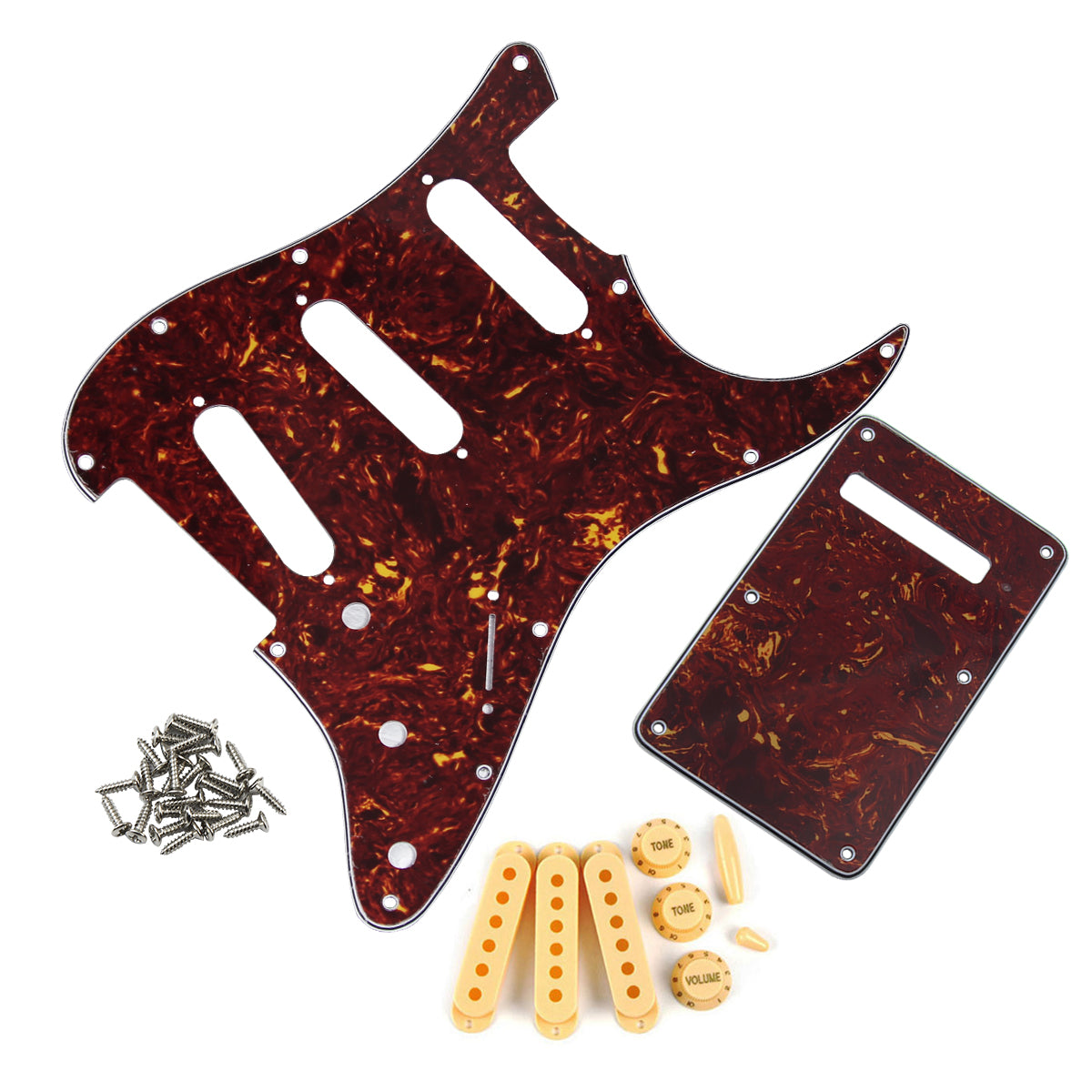 - Pickguard Color: Red Tortoise; 4Ply of (3Ply PVC & 1Ply Celluloid) Material .