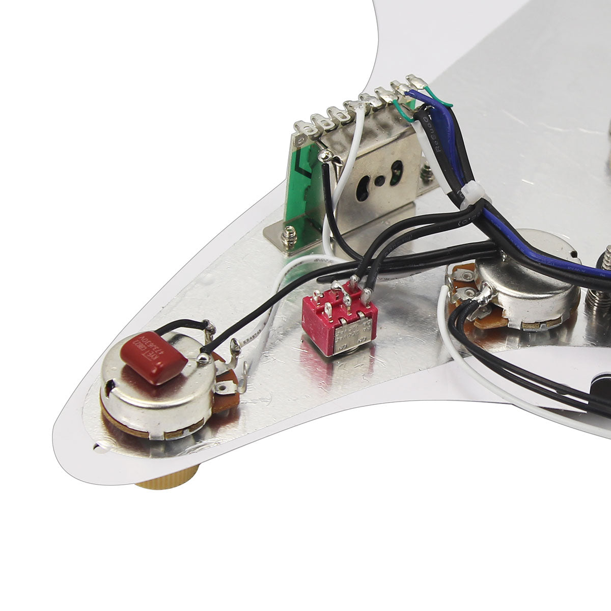 - Le pickguard SSS 11 trous est livré avec un ensemble complet de micros, interrupteur, boutons et circuit précâblé.