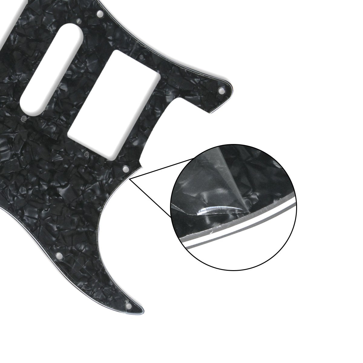- Pickguard de style HSH (humbucker/single/humbucker coil) ; 11 trous de montage à vis sur le côté du pickguard.